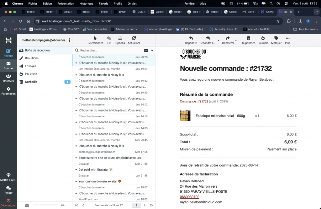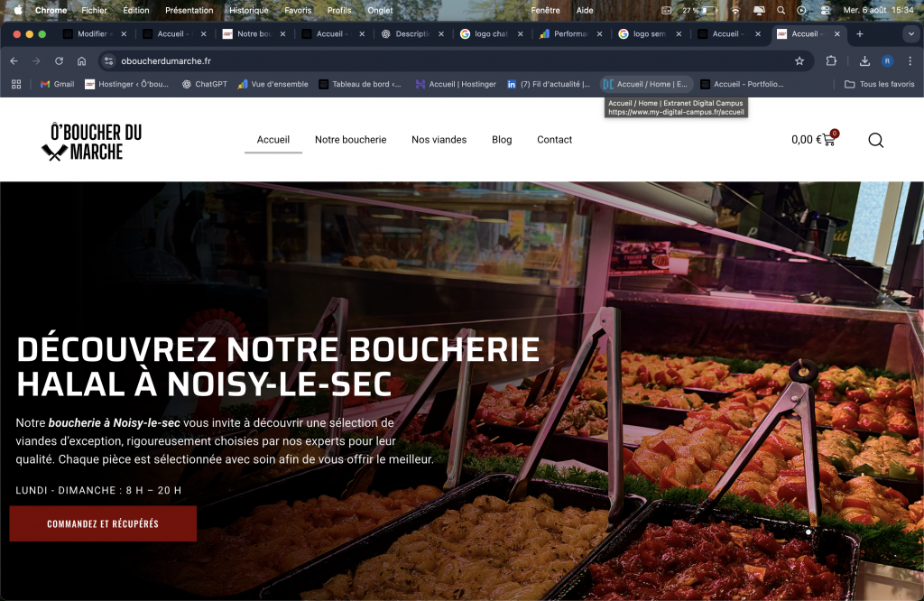 Ô’Boucher du Marché est une boucherie située à Noisy-le-Sec. J’ai été contacté pour concevoir et développer leur site internet. L’objectif n’était pas seulement de créer un site esthétique, mais surtout de proposer une plateforme fonctionnelle, intégrant un système de commande en Click & Collect ainsi qu’un module d’envoi automatique d’e-mails pour simplifier la communication avec les clients.