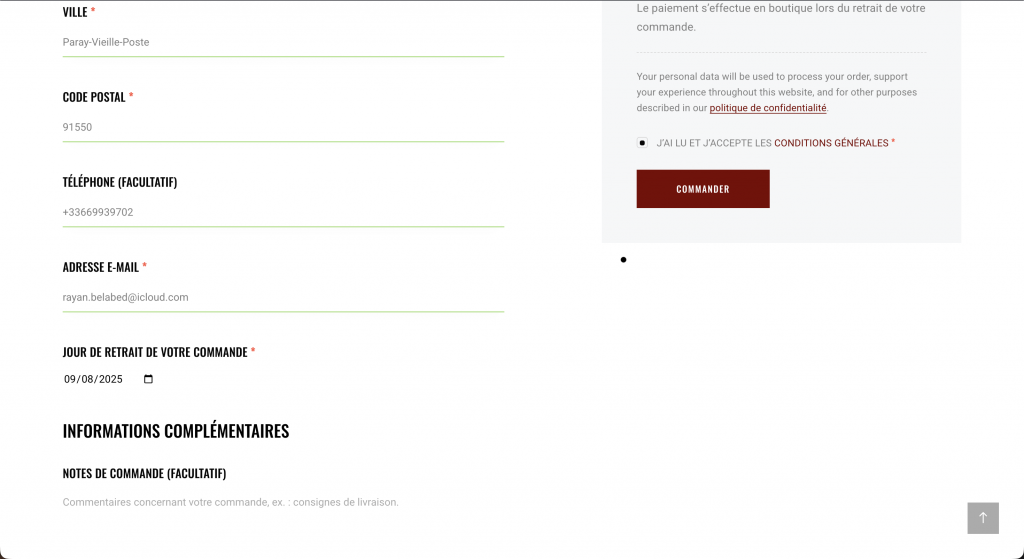La demande initiale du client était claire, mettre en place un système de Click & Collect permettant à l’utilisateur de choisir sa date de retrait. Pour répondre à ce besoin, j’ai intégré la fonctionnalité directement dans WooCommerce, via l’ajout de code personnalisé, afin de garantir un fonctionnement fluide et adapté au site.